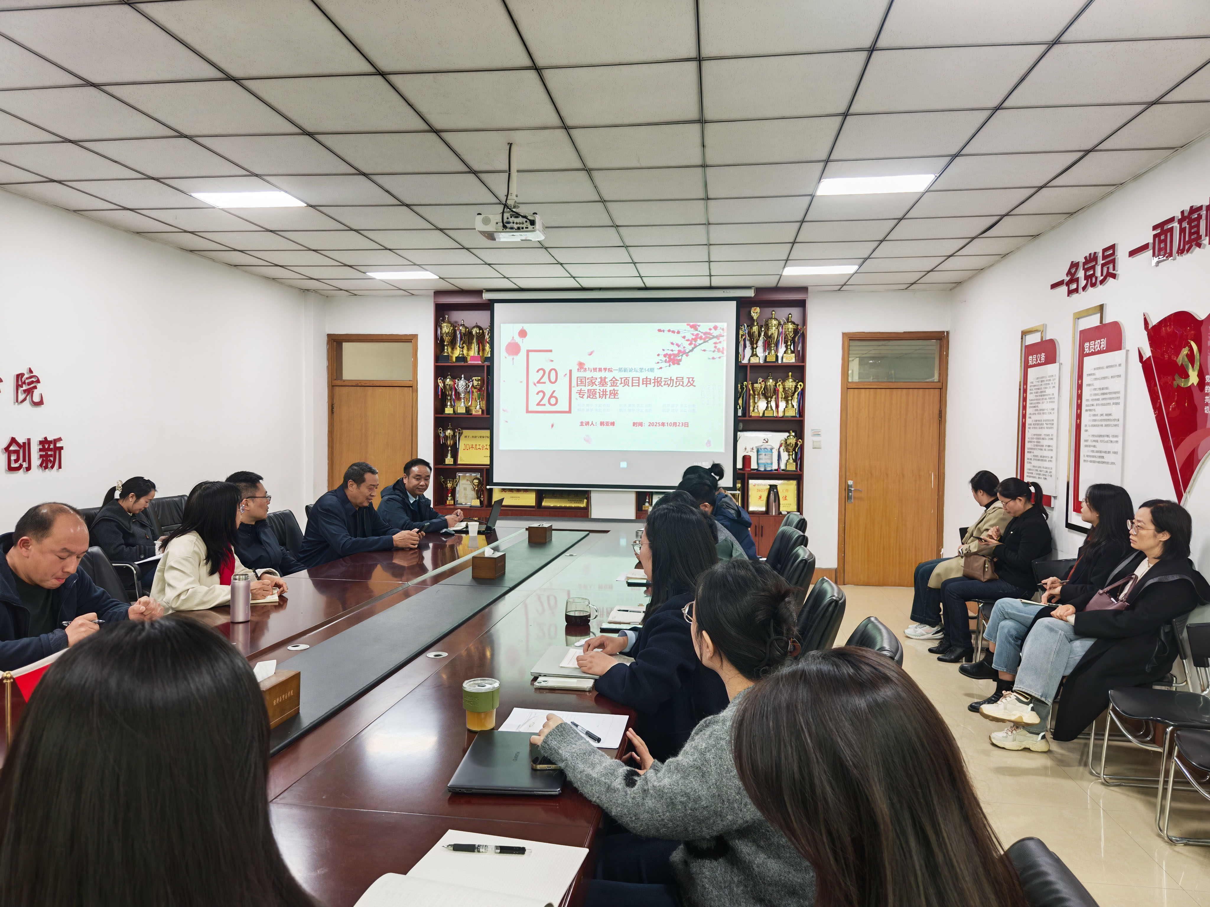 为提升国家社科基金项目申报质量,强化教师科研能力,10月23日下午,经济与贸易学院在327会议室成功举办第14期“拓新论坛学术活动——2026年国家社科基金项目申报动员及专题讲座。活动特邀河南财经政法大学范蠡商学院院长、博士生导师韩亚峰教授作专题报告,学院领导班子、学术骨干及青年教师等20余人参会。会议由副院长杜玲主持。
